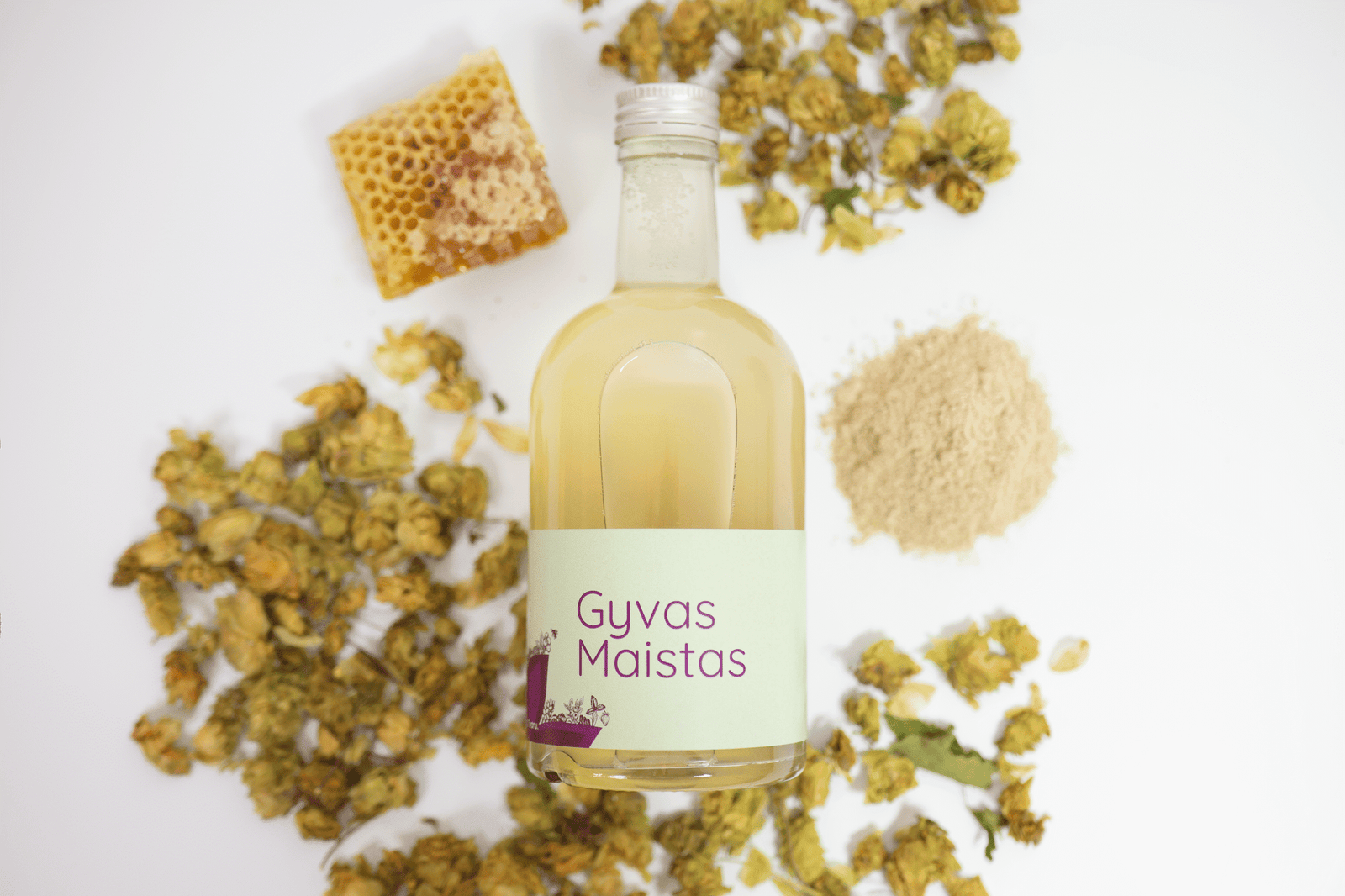 Sudėtis (500ml): gręžinio vanduo, medus, varnalėšos šaknys, margainis, kiaulpienių šaknys, apyniai, probiotinės kultūros.